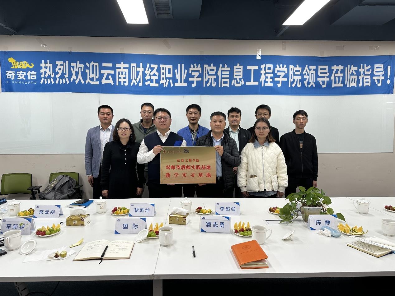 为进一步深化校企合作、产教融合,促进双师型教师培养,助推学院信息安全技术应用专业群建设,2023年11月16日,信息工程学院·实力慧铭数据安全产业学院负责人、信息工程学院负责人一行6人分别到奇安信科技集团股份有限公司(云南办事处)和杭州安恒信息技术股份有限公司(云南办事处)两家企业开展合作交流,并举行 “双师型”教师实践基地(教学实习基地)挂牌仪式。两家企业的主要负责人及相关业务负责人参加了活动。