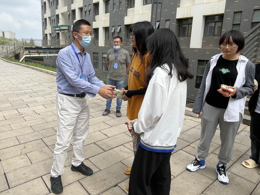 为深入了解新生的思想状态和学习情况,切实加强疫情防控期间学生管理服务。9月9日下午,信息工程学院党支部书记刘珍亿同志、副书记李超强同志,代表学院到二校区看望新生,给每个同学送去了月饼,与学生亲切交流并送上中秋佳节的问候。学校组织部部长习强、学工处处长杨帆、宣传统战部副部长宋芹、宣传统战部干事李晓丹也一同参与了慰问活动。