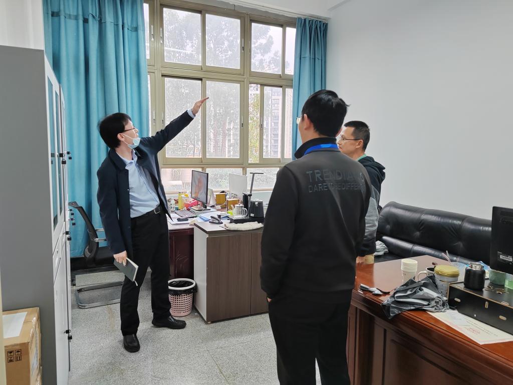 在信息工程学院党支部书记刘珍亿同志和院长钟明江同志的陪同下,张金甫书记耐心地走访、参观了每一间办公室,并对学院的基础设施建设、文化建设、存在的安全隐患提出建设性指导意见。张书记特别指出,学院要加强文化方面的建设,并对楼道文化氛围创建、办公环境改善等提出整改意见。