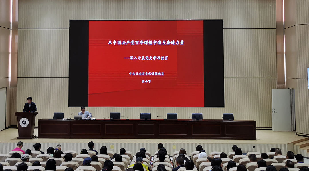 为深入贯彻习近平总书记关于党史学习教育重要讲话,推进我校党史学习教育,学校党委于2021年4月19日下午在报告厅集中开展了党史学习教育宣讲报告会。学校领导、中层及以上干部、各支部支委、党员师生、入党积极分子和全体青马工程学员参加学习,云南省社科院副院长黄小军教授进行授课。