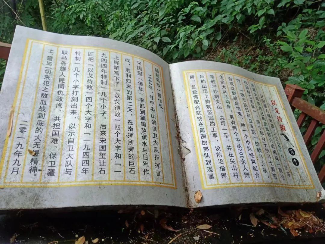 随后,我们前往了班幸社区红色教育基地,那有一处高约四米的蘑菇状岩柱石,上面用魏碑体刻着“以戈待敌”四个大字。这是1944年驻守尖山的自卫大队指挥官宋国玺率部到缅甸芭蕉水与日军作战,胜利归来的第二天,挥笔写下的。这处抗日遗迹时刻提醒着我们,永远不能忘记历史。