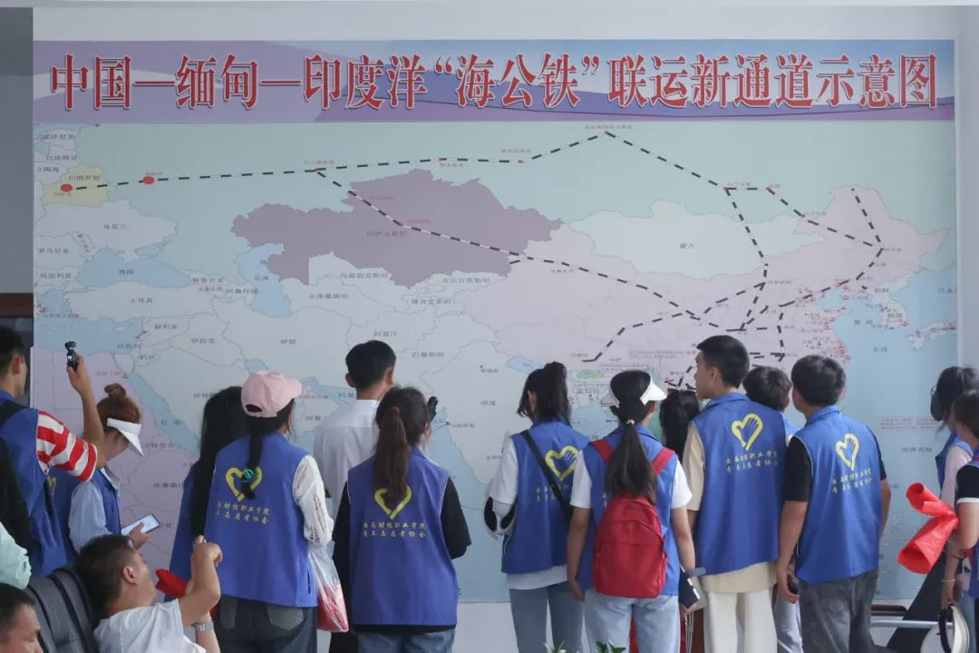 随后,在丁维国老师、潘国平老师和临沧市耿马县孟定镇清水河监督委员会主任字国朝老师的带领下我们参观了清水河口岸新旧国门,感受到祖国的发展与变迁。在参观中缅印度洋新通道出口业务申报大厅时,字国朝老师为我们详细介绍了边境地区工作人员的工作情况以及新旧国门主要负责的领域和进出口货物类型。我们惊喜的发现这里很多工作岗位和我们学校的专业非常对口,如:物流管理、会计等,也希望未来我们有机会来到这里实习、工作,为边境发展,贡献我们青春力量。