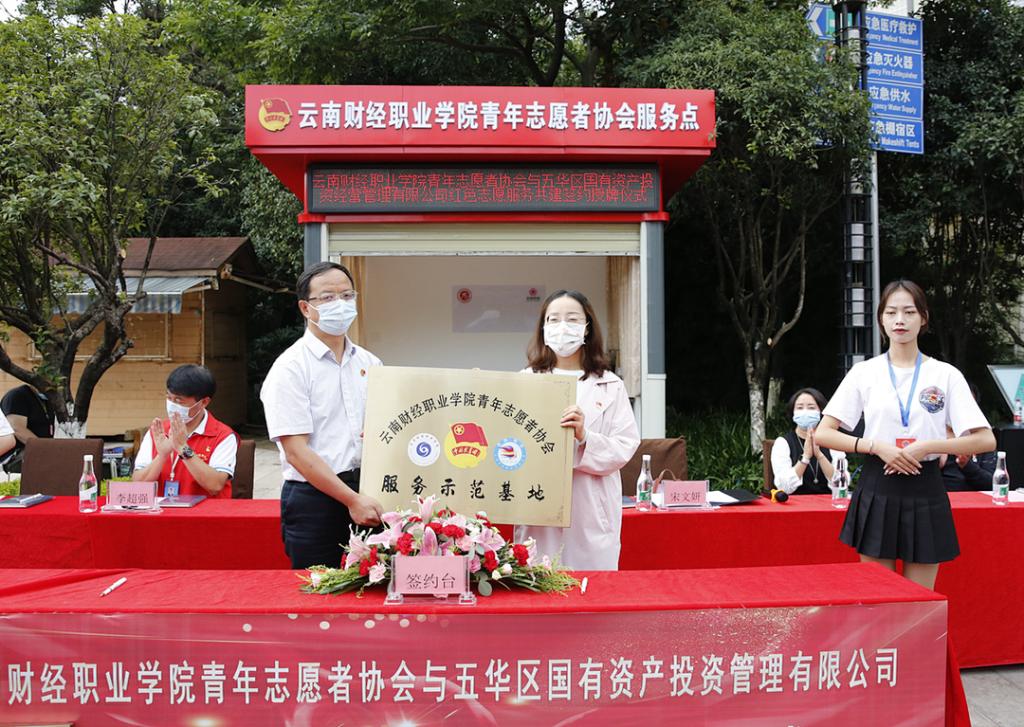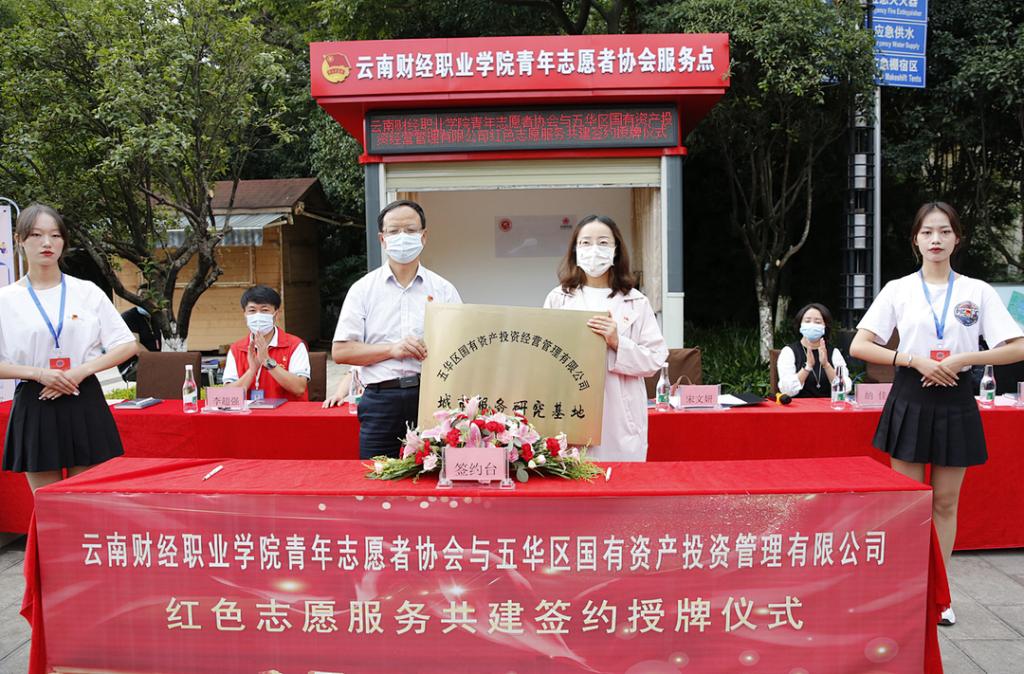 为深入贯彻落实习近平新时代中国特色社会主义思想,贯彻落实党的十九大和十九届二中、三中、四中、五中全会和习近平总书记“七一”讲话精神,积极培育和践行社会主义核心价值观,大力弘扬“奉献、友爱、互助、进步”的志愿精神,根据省、市推进爱国卫生“7个专项行动”和各类争创专项活动相关工作部署,切实落实《五华区国企党建工作“一企一策”建设和“一企一品牌”创建实施方案》,云南财经职业学院青年志愿者协会与五华区国有资产投资经营管理有限公司于9月16日在月牙潭公园举行红色志愿服务共建签约授牌仪式,双方领导及部分教师、青年学生代表参加仪式。