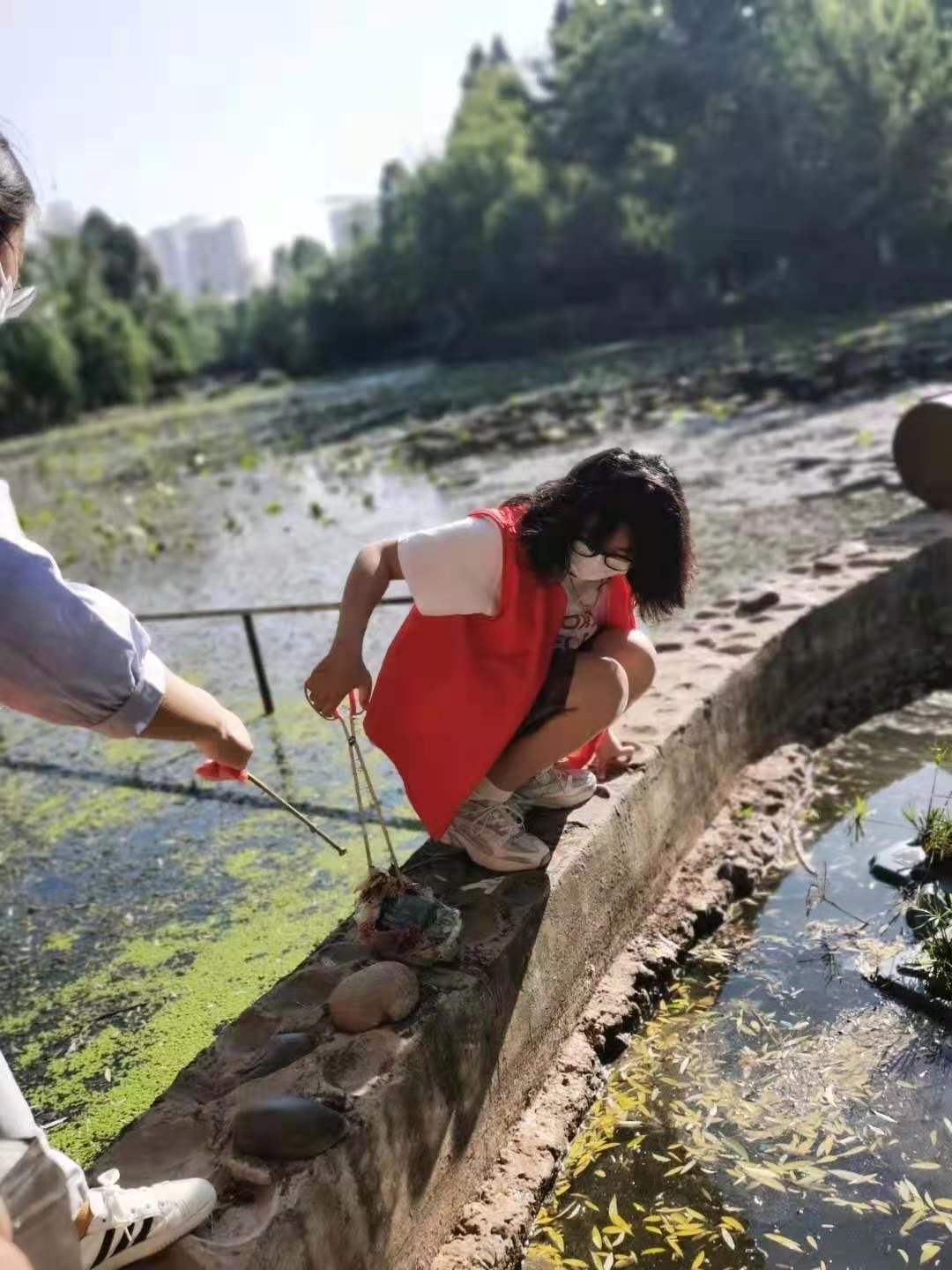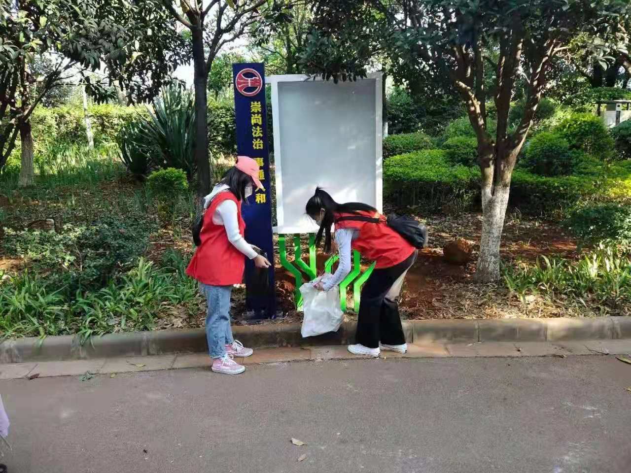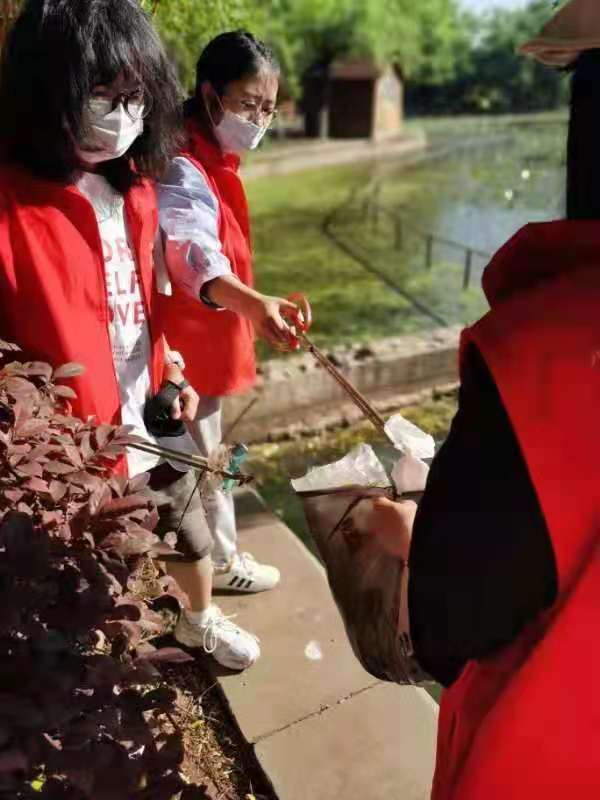 伴随着朝阳,在团委老师们的带领下,身穿红色志愿服的志愿者们手拿垃圾钳、垃圾袋、扫帚等工具,开始了对公园卫生清理工作。志愿者们奔波在公园的各个角落,认真细致的将草坪、路边、树坑、花台里的垃圾捡拾干净。活动从早上 8 点开始,一直持续到了 11 点。