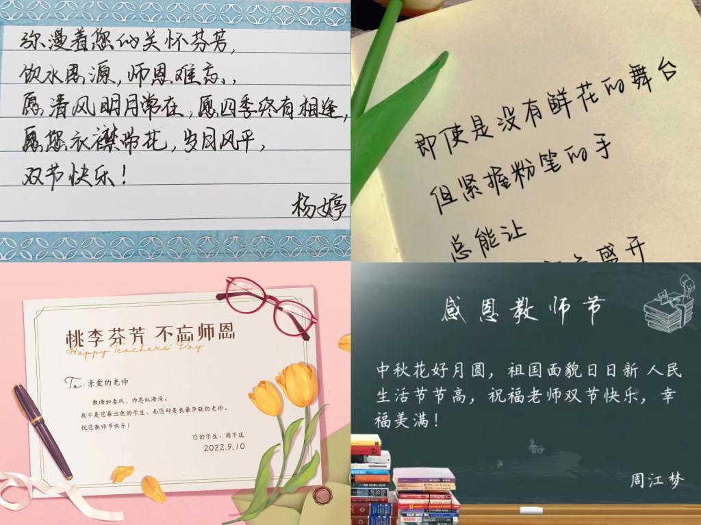 月满中秋,师恩难忘。同学们纷纷为老师们送上了形式各异、内容丰富的祝福。生动的短视频、温暖的图文、诚挚的短语卡片都充分展现了同学们的感恩之情。活动截止之前,同学们创意不断,营造了浓厚的节日氛围,一句句暖心的话语,一张纸简单的卡片,无不表达了他们朴实而真挚的感恩和祝福。