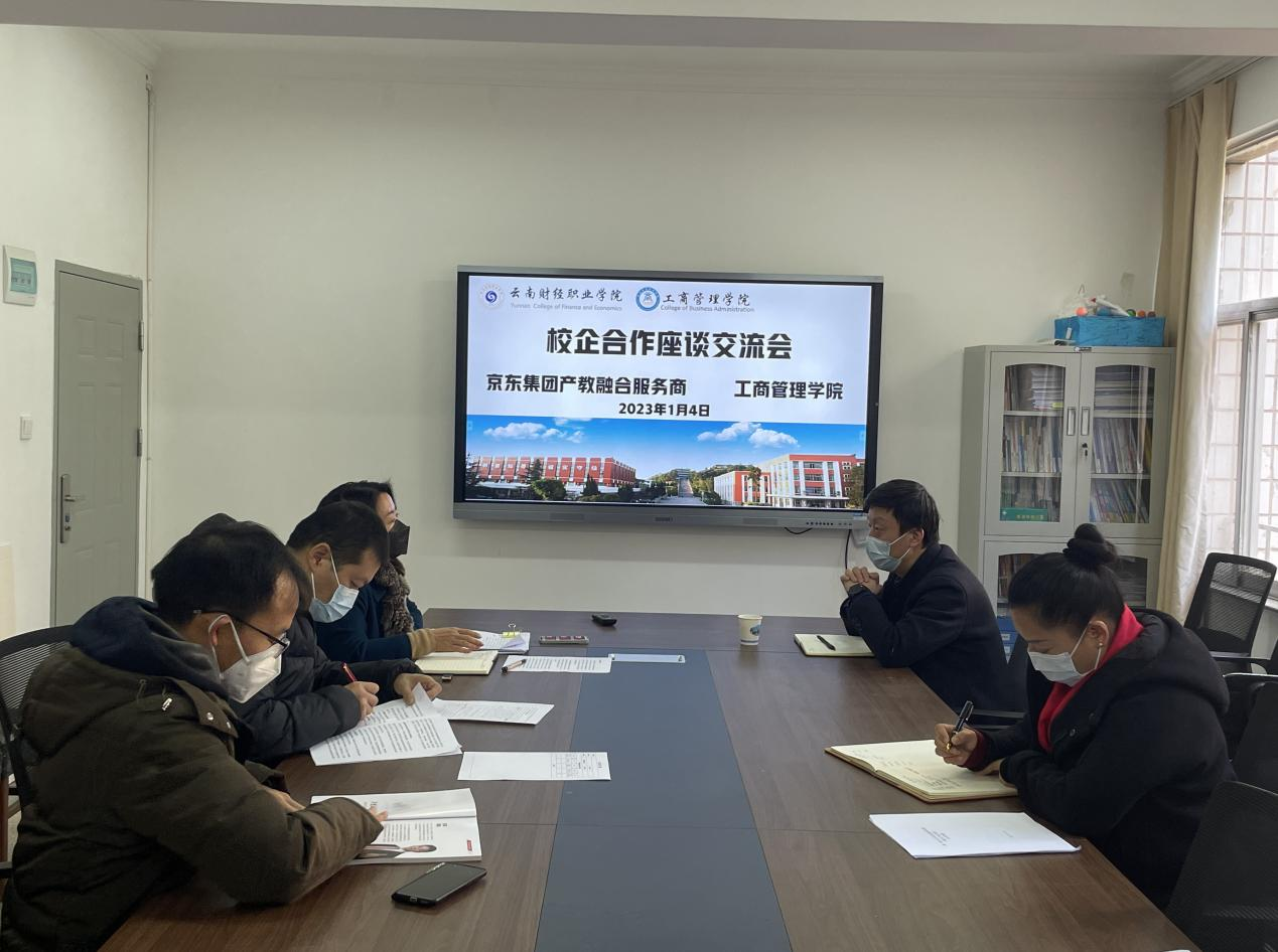 2023年1月4日,工商管理学院邀请京东集团产教融合服务商云南区域的总监到院进行校企合作交流。在座谈会中围绕校企合作共建产业群为主题,了解企业的优势和特点,结合学院目前情况和未来发展需求,对引产入校推进学院高水平专业建设进行了深入交流。