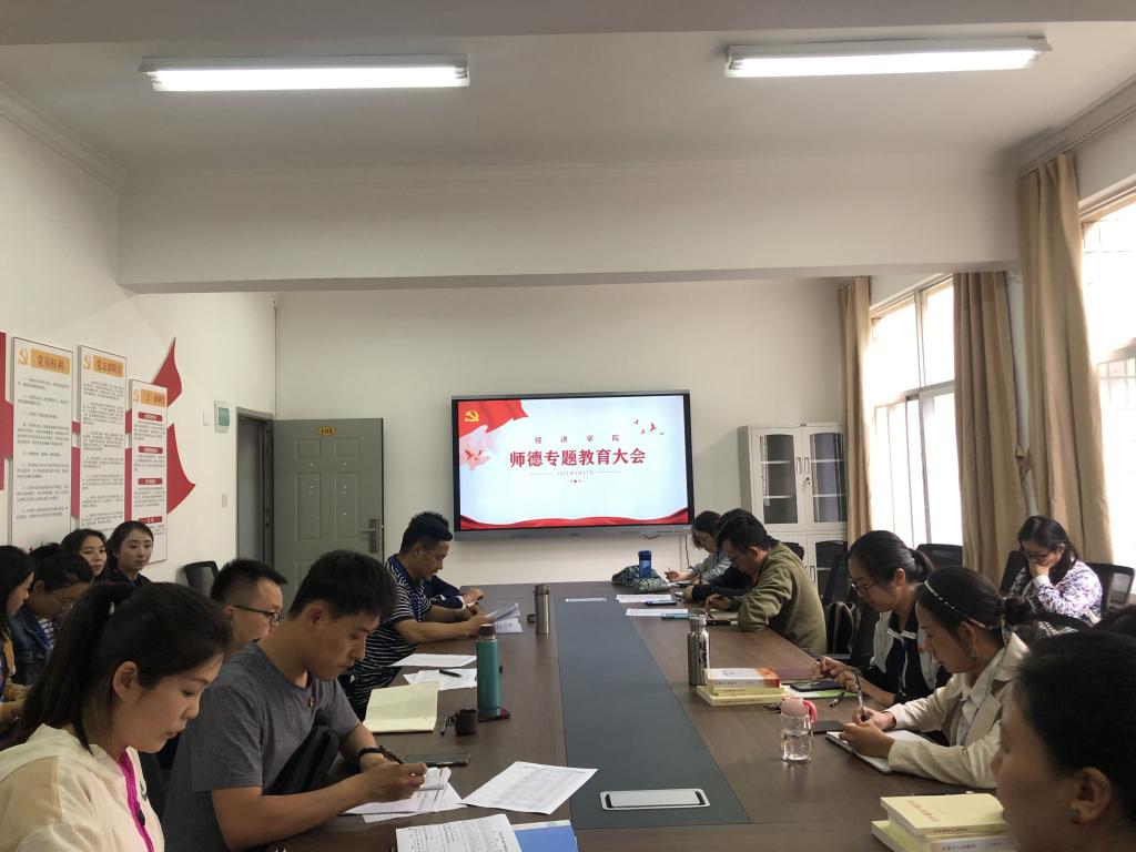 2021年5月27日13:00,经济学院在党史学习教育主题活动中召开师德专题教育大会,贯彻落实《教育部关于在教育系统开展师德专题教育的通知》(教师函〔2021〕3号)精神,经济学院全体专兼职教师参加教育大会。