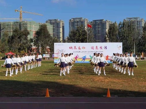 参赛女生们的微笑如清晨的阳光般灿烂,跳跃如同精灵般灵动,旋转如同旋风般轻盈。她们用飞扬的长发、随风摆动的裙摆、青春的激情和灵动的舞步形成了运动会赛场上的一道美丽风景线。多少天的艰苦训练,多少次的辛苦磨合,只为今天配合得天衣无缝,只为今天绚烂夺目。