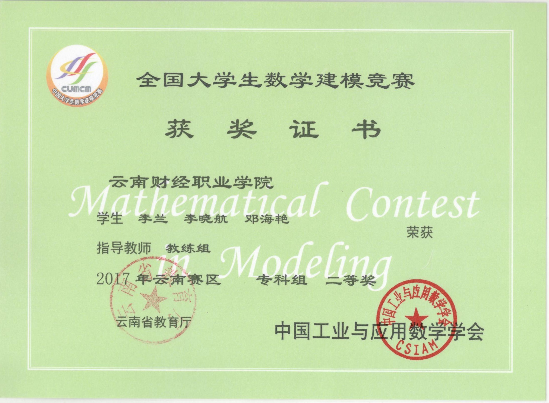 日前,2017年全国大学生数学建模竞赛云南赛区颁奖仪式暨数学建模竞赛指导工作经验交流会在楚雄师范学院举行。我院学生李兰、李晓航、邓海艳组成的代表队荣获2017年全国大学生数学建模竞赛云南赛区专科组二等奖。另外,学院还有3支代表队参加了比赛并成功提交了参赛论文。在此谨向成功参加比赛尤其是获奖的同学和教练组指导教师表示热烈的祝贺!