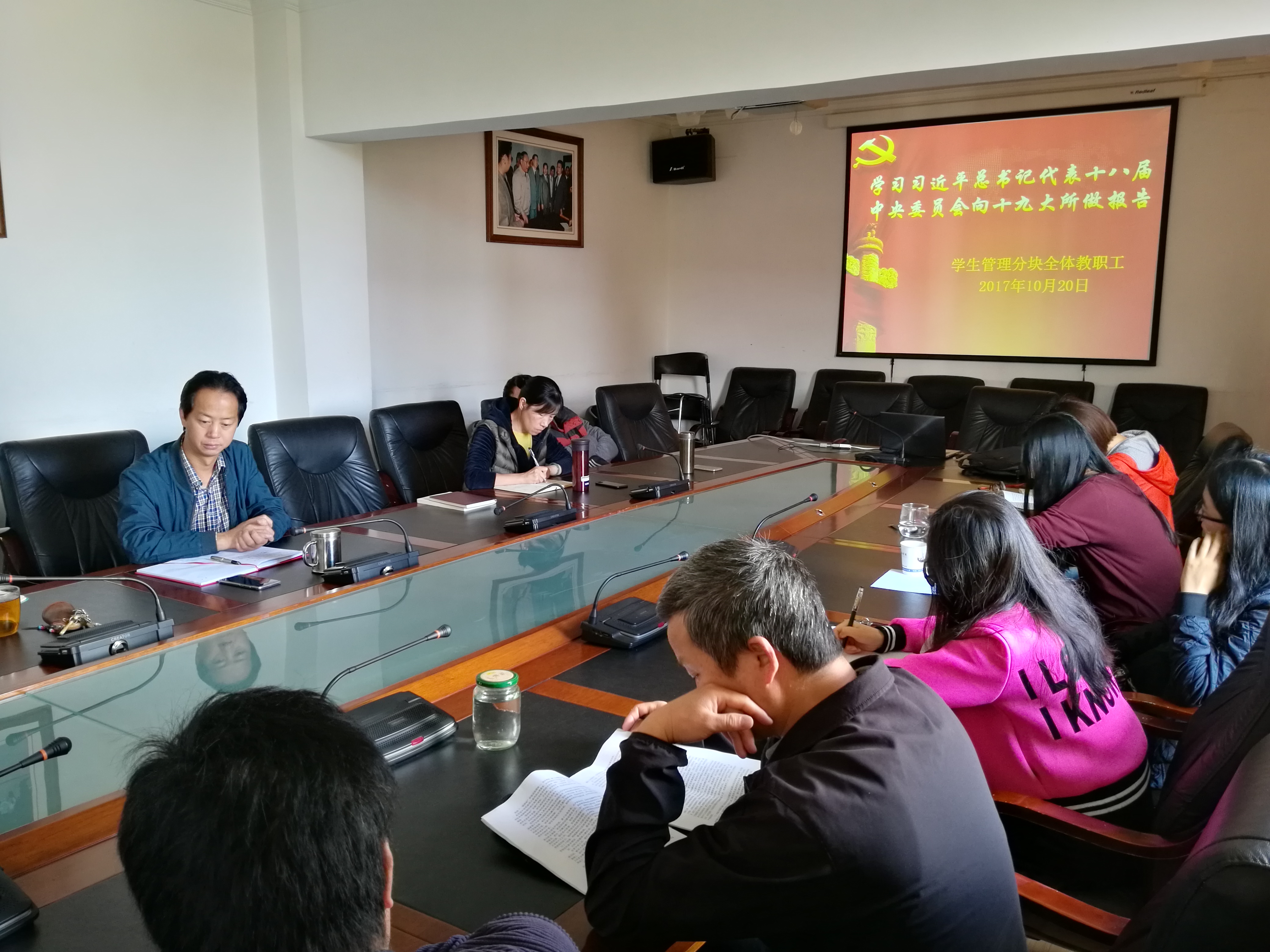 2017年10月20日下午,为深入学习贯彻和落实习近平总书记十九大工作报告精神,学生管理支部在学校第一会议室举行学习党的十九大工作报告专题组织生活会,支部9名党员及2名入党发展对象参加本次会议,会议由支部书记刘宁飞同志主持。