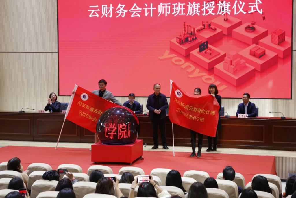 校企双方领导、老师和同学们的共同见证校企双方在前期良好合作的基础上,共同签约并共建“云南财经职业学院数智产业学院”,开启数字化产业学院合作新时代,共同培养数字化人才,并举行了“云南财经职业学院-新道公司校企合作、协同育人数智化产业学院”授牌仪式。随后,校领导嘉宾别向云财务会计师会计1班,会计2班授予班旗。
