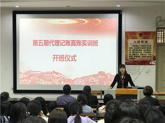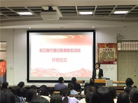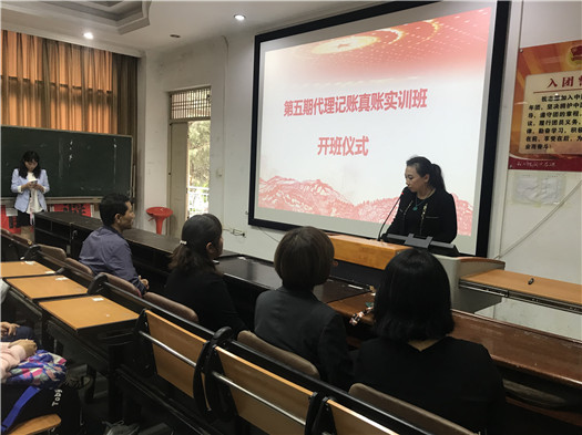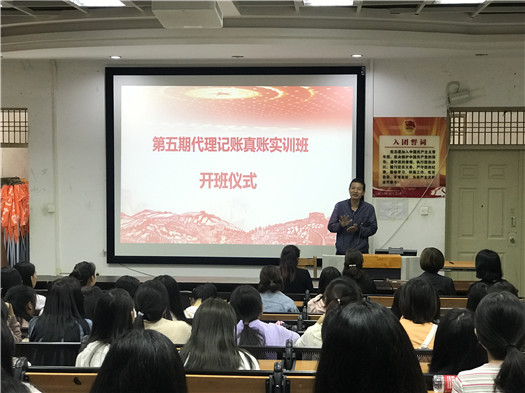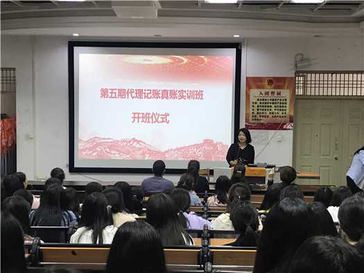 2019 年 9 月 9 日下午,第五期代理记账真账实训班开班仪式在训导楼多媒体教室举行。开班仪式由会计系辅导员禄怡主持,昆明市商务代理协会会长仲美颐、云南省代理记账行业协会秘书长孟宏仓、校企合作处副处长石彬、会计系主任尹湘萍、党支部书记杨雯婷和协会派驻指导教师许烨、柴瑞雪参加了此次开班仪式。