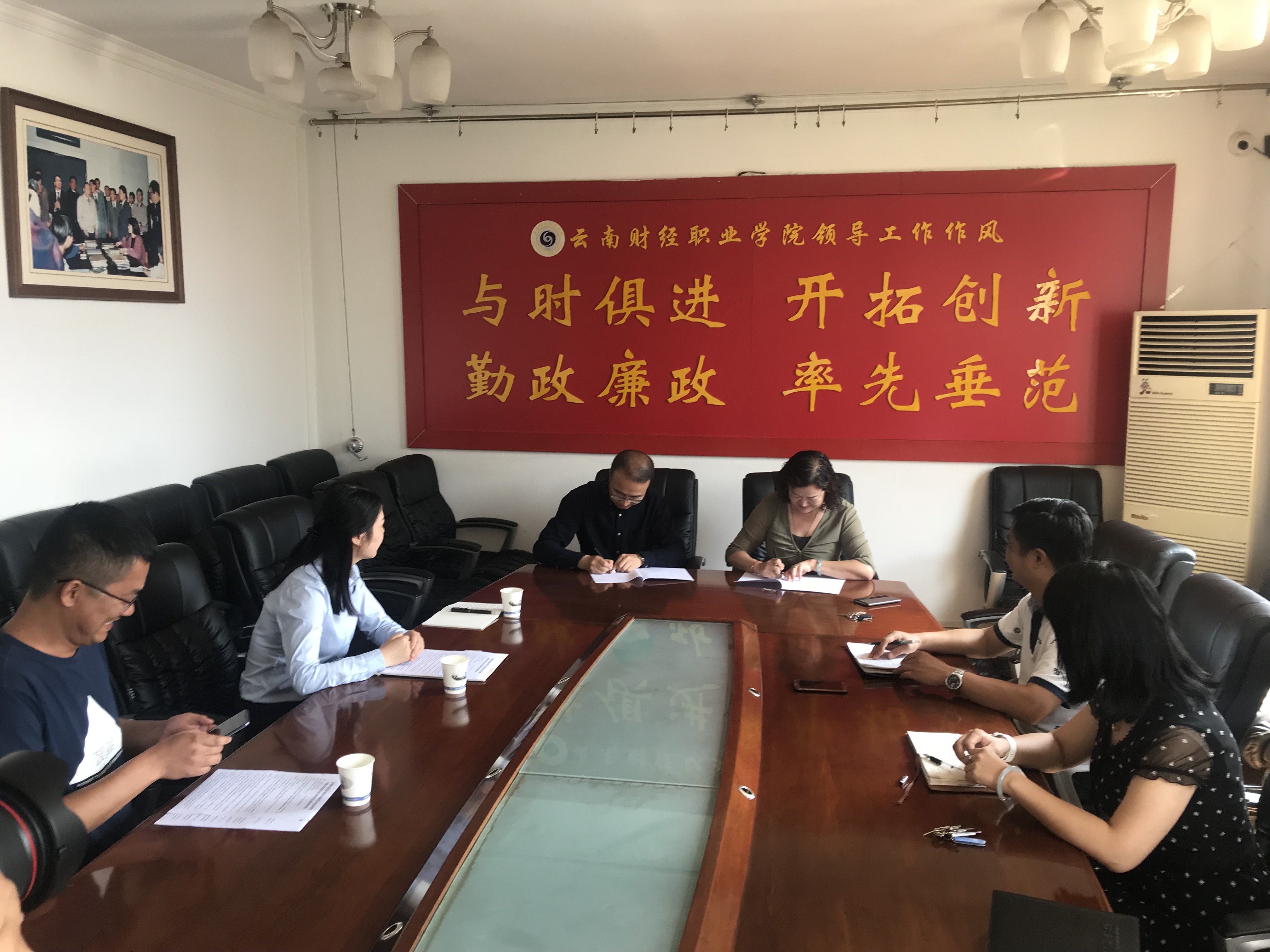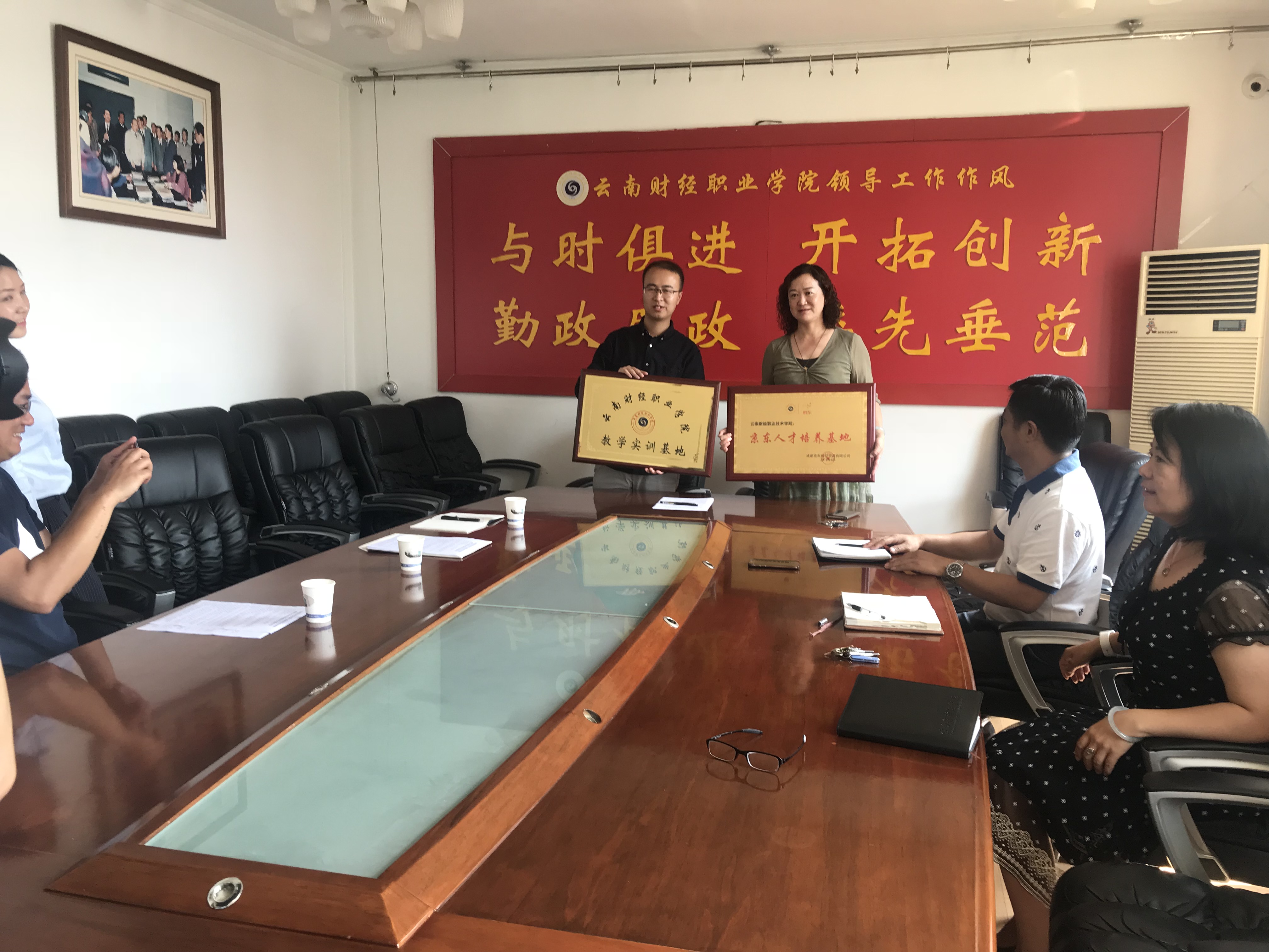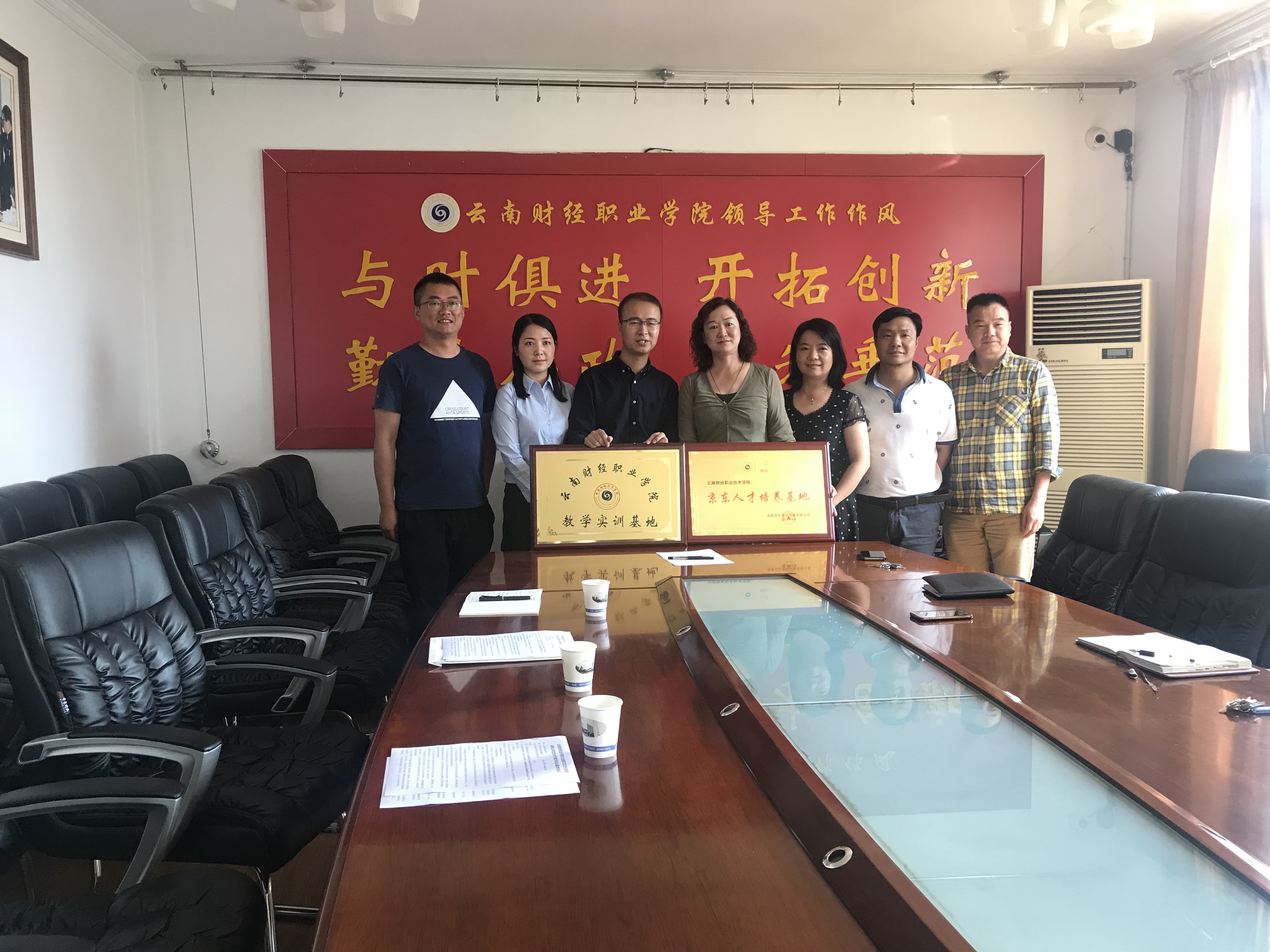 为了促进企校双方合作交流,拓宽毕业生实习就业渠道,实现以需促学、学以致用的目的,同时提高企业实习生的技能水平,实现双方人才培养和人力资源开发战略校企经充分协商,2018年6月8日,在学校办公楼二会议室举行学校与云南京东物流公司签约及授牌仪式。学院副院长沈豫琼、京东物流云南分公司人力资源经理毕青云、配送部人力资源经理杨静、仓储部人力资源主管罗忠银以及工商系、校企合作处的领导参加了签字仪式 。