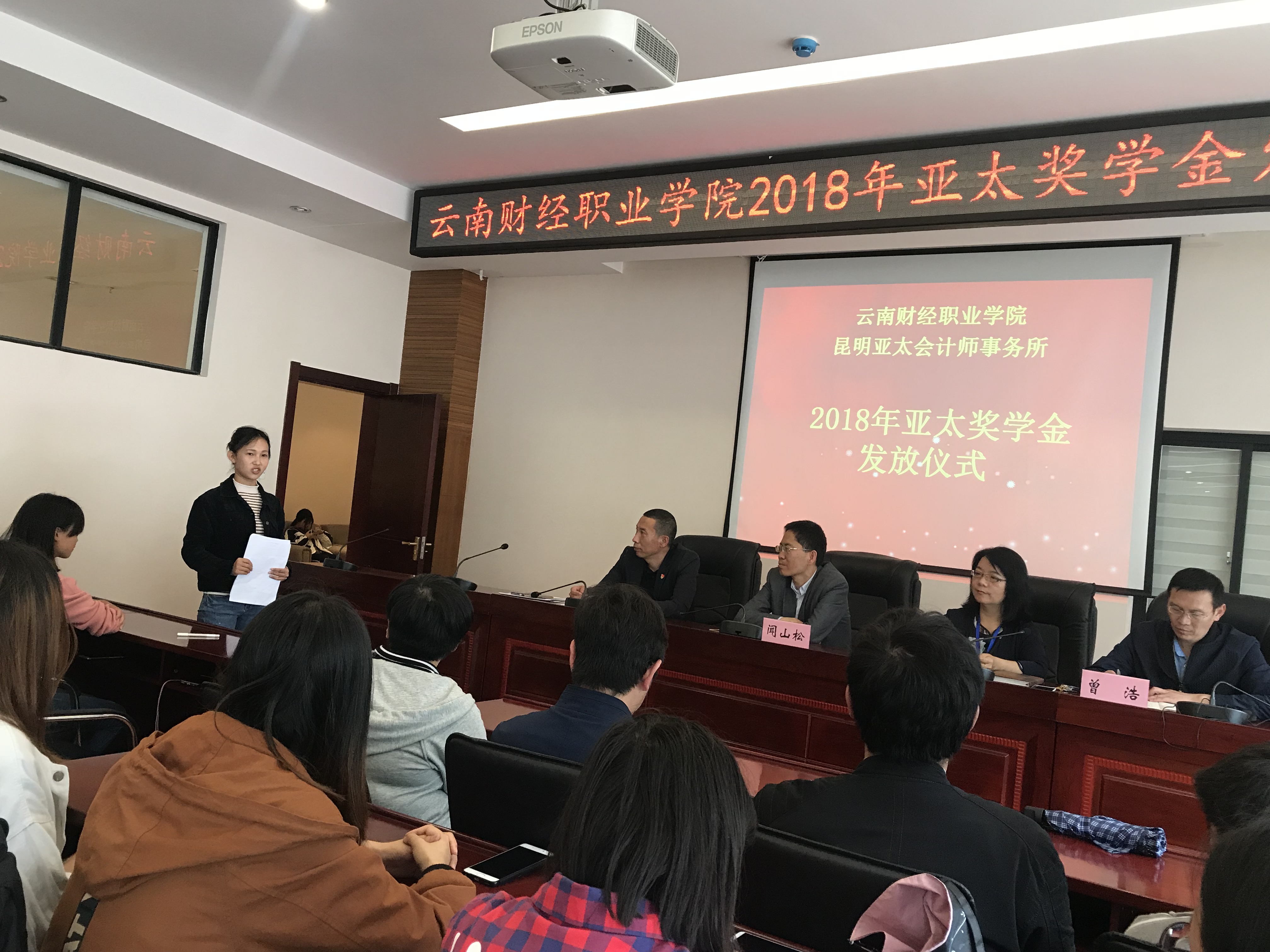 2015级会计四班学生钟清娣代表获奖学生讲话。她向昆明亚太会计师事务所表达了感谢之情,企业在获得长足发展的道路上,还不忘对学子的激励和关怀,正是因为有这样的优秀企业,学生在获得物质上资助的同时,精神上也获得了更大的前进动力。