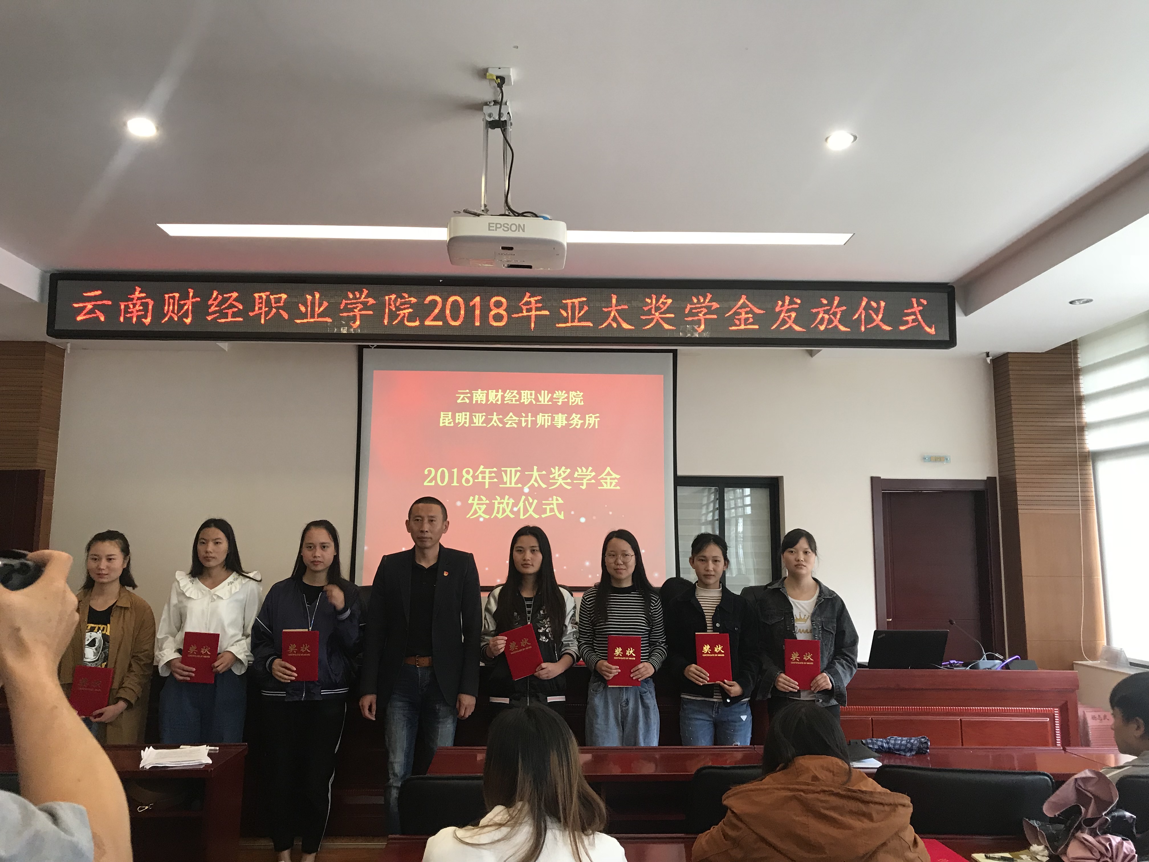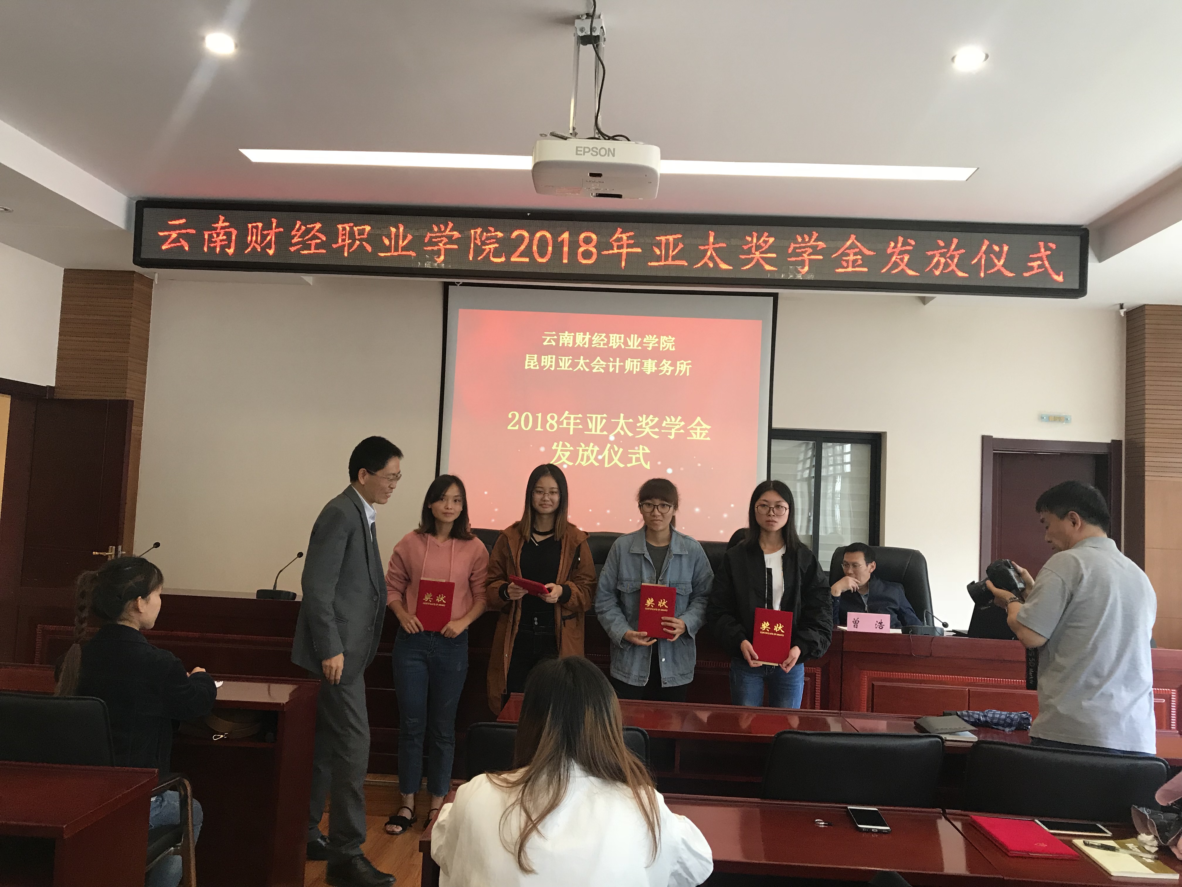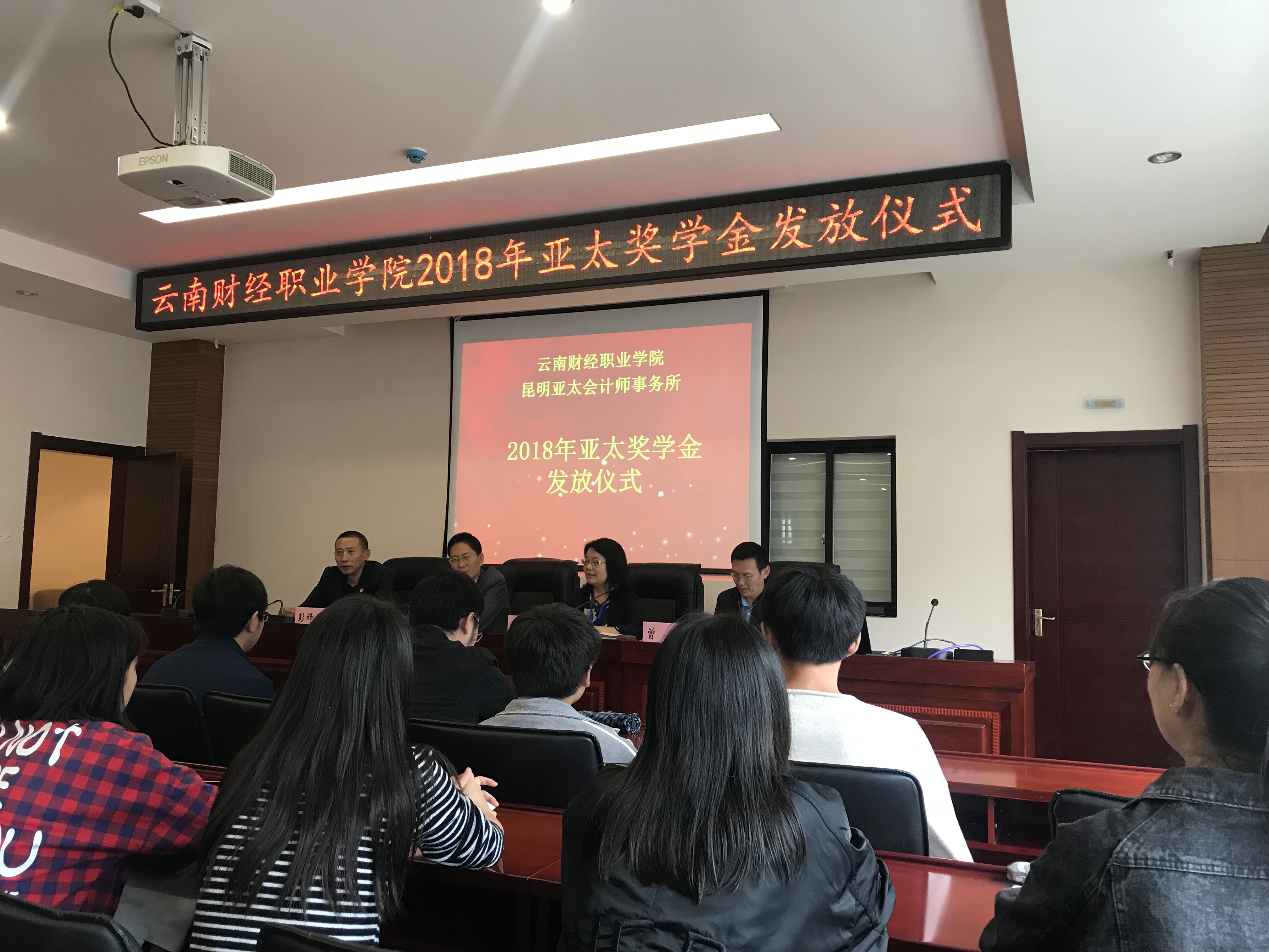 2018年6月15日下午,2018年“亚太奖学金”发放仪式在财苑楼三楼多媒体教室举行。院长助理彭锋泽出席,昆明亚太会计师事务所所长闻山松,相关职能部门负责人,以及获奖学生与会。会议由校企合作处副处长石彬主持。