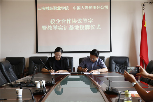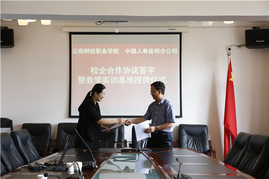 2018年6月22日上午,学校与中国人寿保险股份有限公司昆明分公司“云南财经职业学院教学实训基地”和“中国人寿人才培养基地”合作签约授牌仪式在学校办公楼一会议室举行。