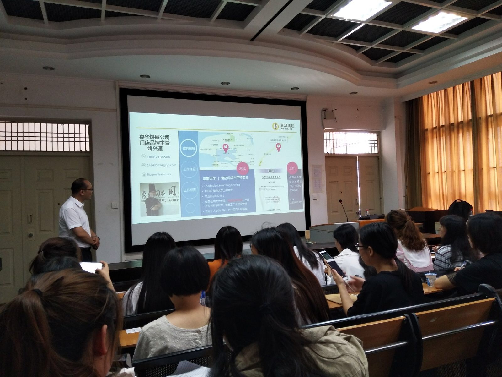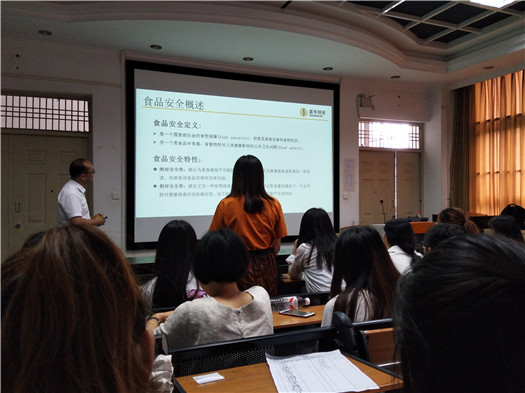 姚兴源老师自我介绍完以后就正式进入课堂内容,为同学们介绍各种食品存在的安全隐患,产品的质量概述,与同学进行互动,提问同学了解哪些嘉华的食品,然后为不了解相关知识的同学拓宽了知识面。姚老师还为同学们准备了礼物卡,凡是积极与老师互动的同学都能得到礼物卡。
