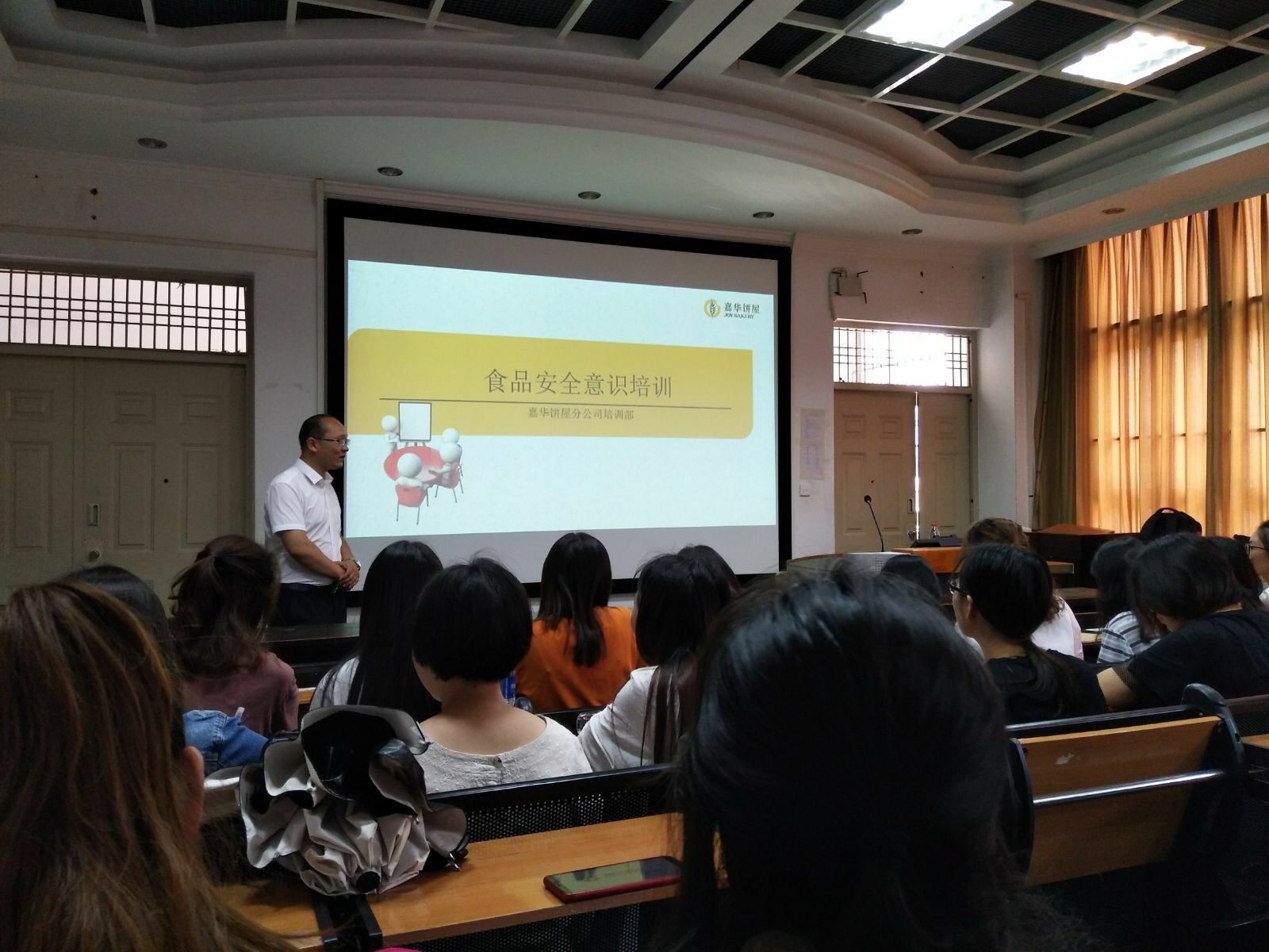 2018年6月28日下午,首届“嘉华班”学生准时到达学院训导楼二楼多媒体教室上课。本次课程由云南嘉华饼屋公司门店品控主管姚兴源老师组织授课。培训内容主要是食品安全意识培训,包括食品安全概述、产品质量概述、门店食品安全和公司管理制度等四个方面。