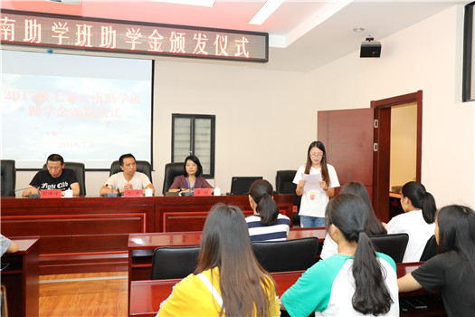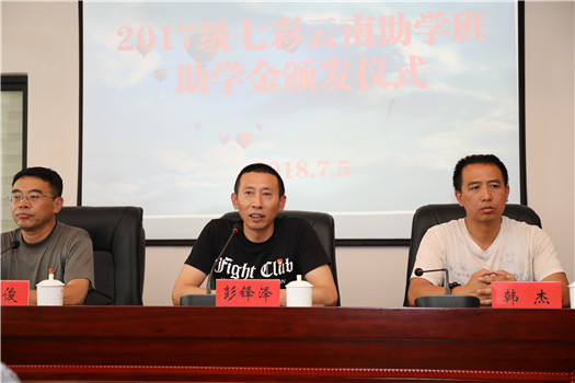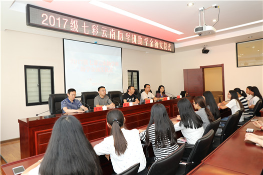 2018年7月5日下午,我校2017级七彩云南助学班助学金颁发仪式在财苑楼多媒体教室举办。院长助理彭锋泽、工商系书记董俊、财税金融系书记韩杰、会计系副主任曾浩、校企合作处副处长石彬以及四十名受助学生参加了此次颁发仪式。