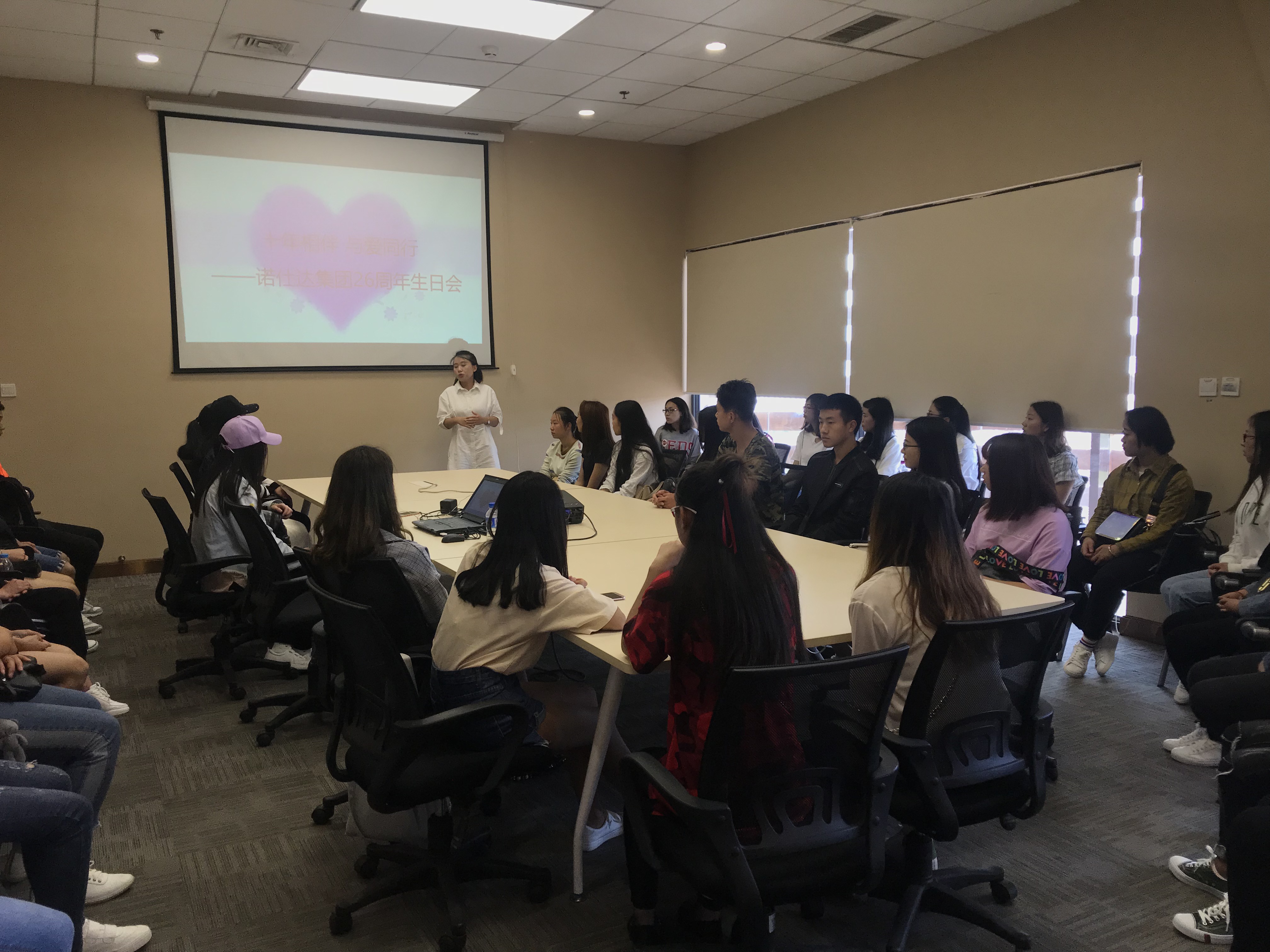 活动环节结束后,同学们开始了今天的最重要的环节——为诺仕达集团庆生,过她26岁的生日,2015级在企业实习的学姐学长向同学们分享了他们的人生经历和工作体验,以及又一次对诺仕达集团的介绍,同学们再次感受到诺仕达集团成立至今的艰辛与不易,也感受到诺仕达人身上的品质和精神,同时也为企业不断的发展壮大而自豪,为自己以后职入诺仕达集团而做好沉淀。