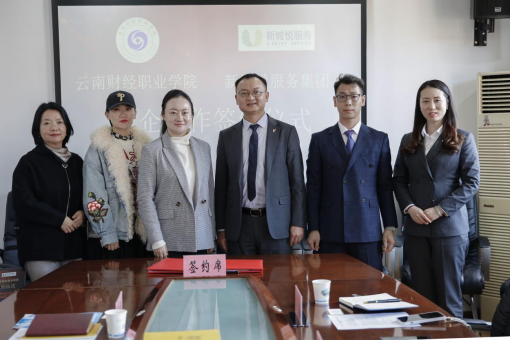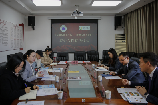 2021年11月29日,云南财经职业学院与新城悦服务集团校企合作签约仪式在学校办公楼二会议室举行。新城悦服务集团西南区域公司总经理吕川、昆明城市公司城市总经理马金、综合管理部负责人彭美茜,学校副校长严黄一仪、招生就业与合作交流处处长严颖、副处长石彬出席签约仪式。
