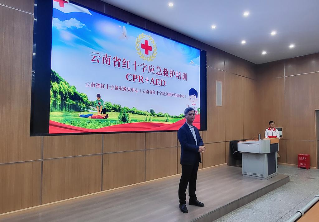 学校党委副书记仲新同志做开训动员,指出开展应急救护培训的重要性,鼓励参会师生认真参与培训,切实掌握应急救护知识和技能,同时对云南省红十字备灾救灾中心各位老师的到来表示感谢。