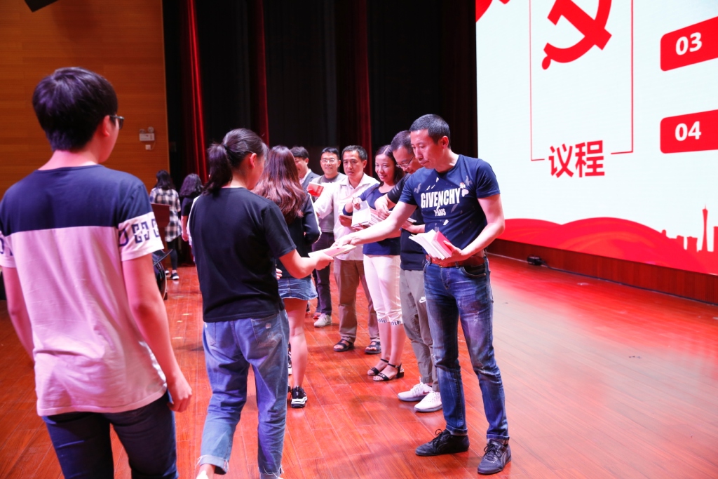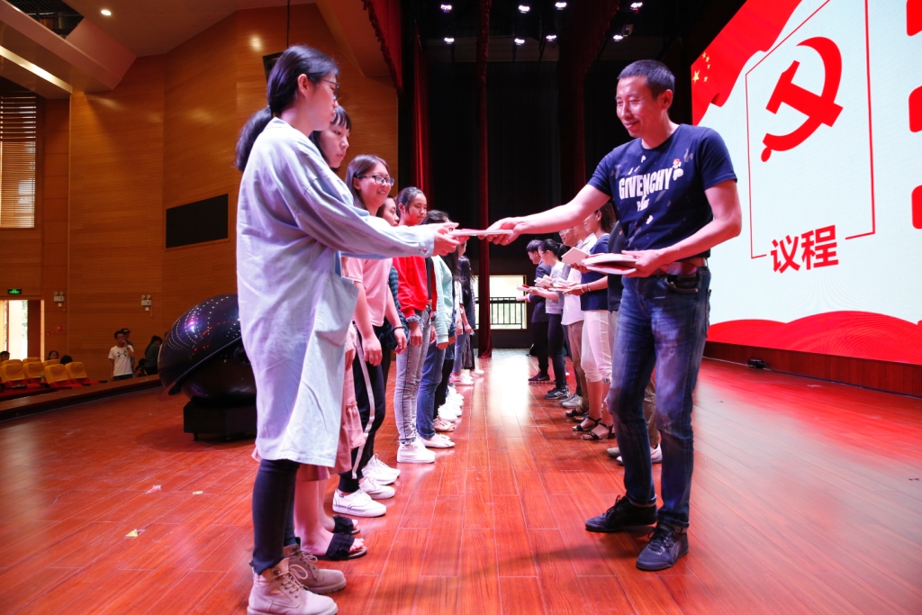 参与本次活动的党员同志们为同学们逐一发放中国共产党章程和抄写笔记本。