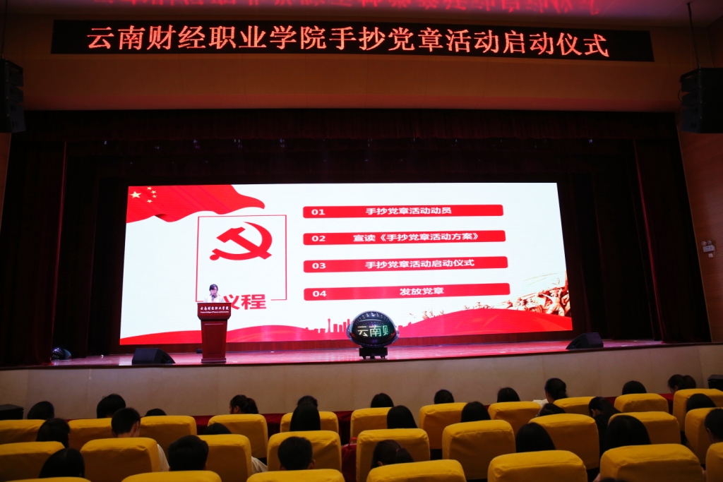 为了积极响应党的号召,加强我校学生党团建设,引导我校入党积极分子和有意愿向党组织靠拢的同学明确入党动机,坚定理想信念。加强爱国主义教育,深化中国共产党史、中华人民共和国史、改革开放史和社会主义发展史教育,引导同学坚定中国特色社会主义道路自信、理论自信、制度自信、文化自信。增进对中国特色社会主义的思想认同、政治认同、理论认同和情感认同。我校在学生中开展学习并抄写新党章活动,特制定《“手抄党章”活动方案》。本次活动由宣统部、学生工作部、团委三部门主办,会计系、财税金融系、工商管理系、信息工程系协办并在同学中广泛动员,积极配合开展“手抄党章”活动。2018年7月10日,云南财经职业学院手抄党章活动启动仪式在学校大礼堂顺利举行,启动仪式由学生处副处长马佳佳同志主持。本次活动由同学自愿报名并提交申请,参与人员为各教学系入党积极分子和有意愿向党组织靠拢的同学。