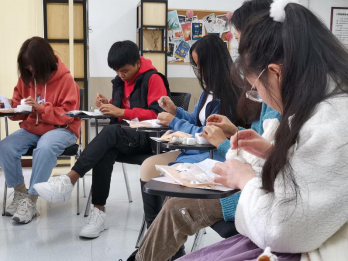 (同学们在认真的制作手工)