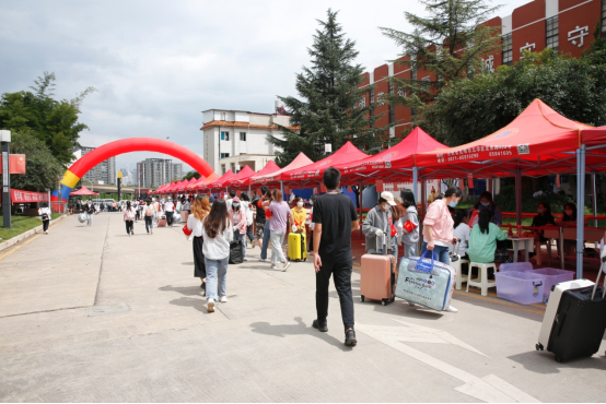 红旗映日随风扬,丹桂飘香花芬芳。迎新现场紧张有序,忙而不乱。热心的志愿者们佩戴红袖标,个个精神饱满,在各自的岗位上各司其职,从站点接待、扫码签到、行李搬运到入住宿舍,有条不紊地帮助新同学办理入学手续。