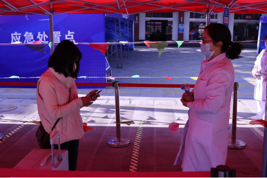 返校学生到达报到点后需经过行李消毒、值班工作人员查验返校审批资料、医务人员测量体温方可进入校园。
