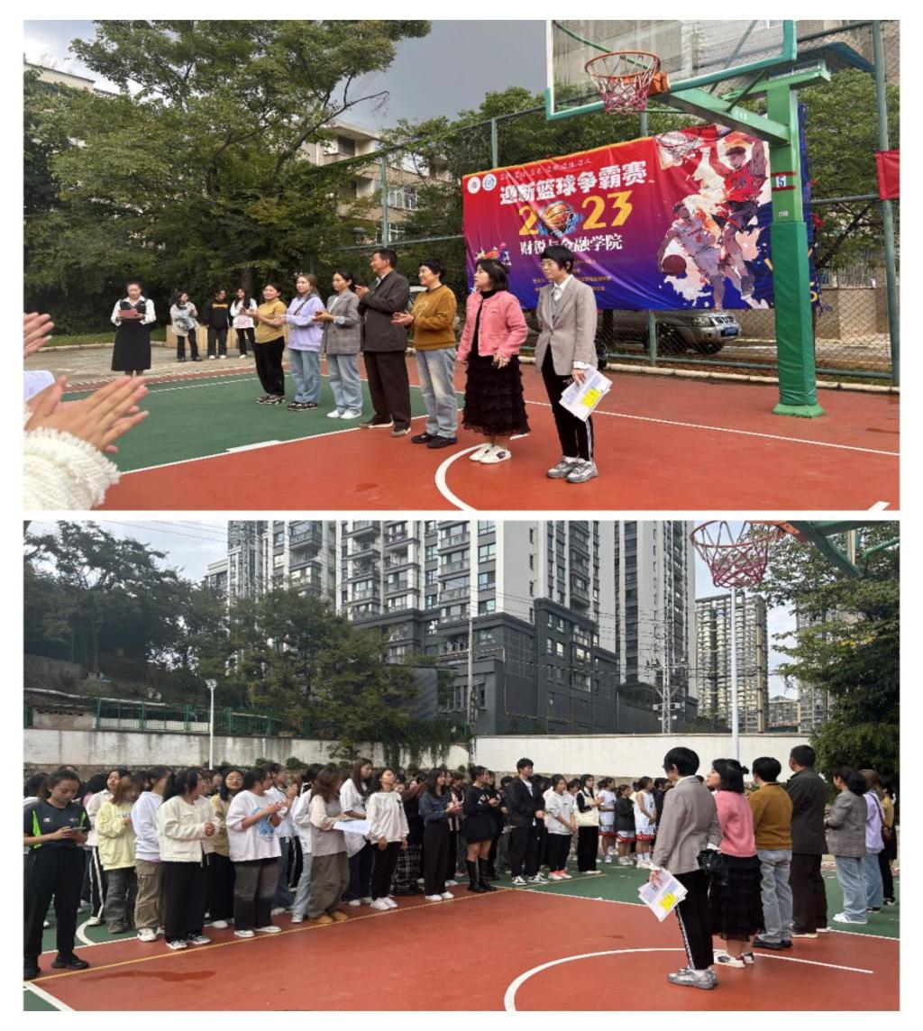 本次开赛仪式由熊文馨主持,学院党支部书记罗勇老师致辞,裁判员代表祝钱与运动员代表宣誓,公共课教学部党支部书记、段淑芳老师宣布2023年财税与金融学院“鼎新杯”篮球赛开赛。
