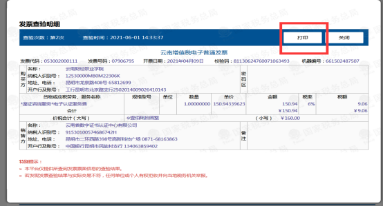 3、点击查验后跳转至发票查验明细界面,点击打印即完成电子发票查验。