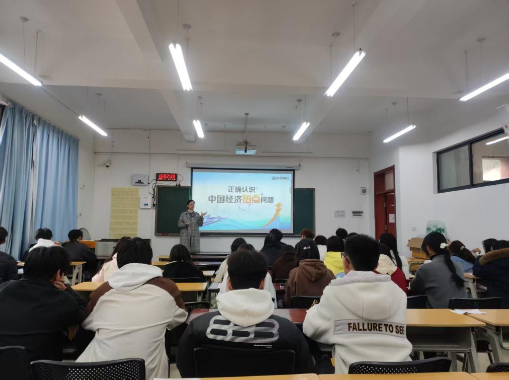 2025年11月3日下午,副校长沈豫琼为学生讲授题为《正确认识中国经济热点问题》的形势与政策课。