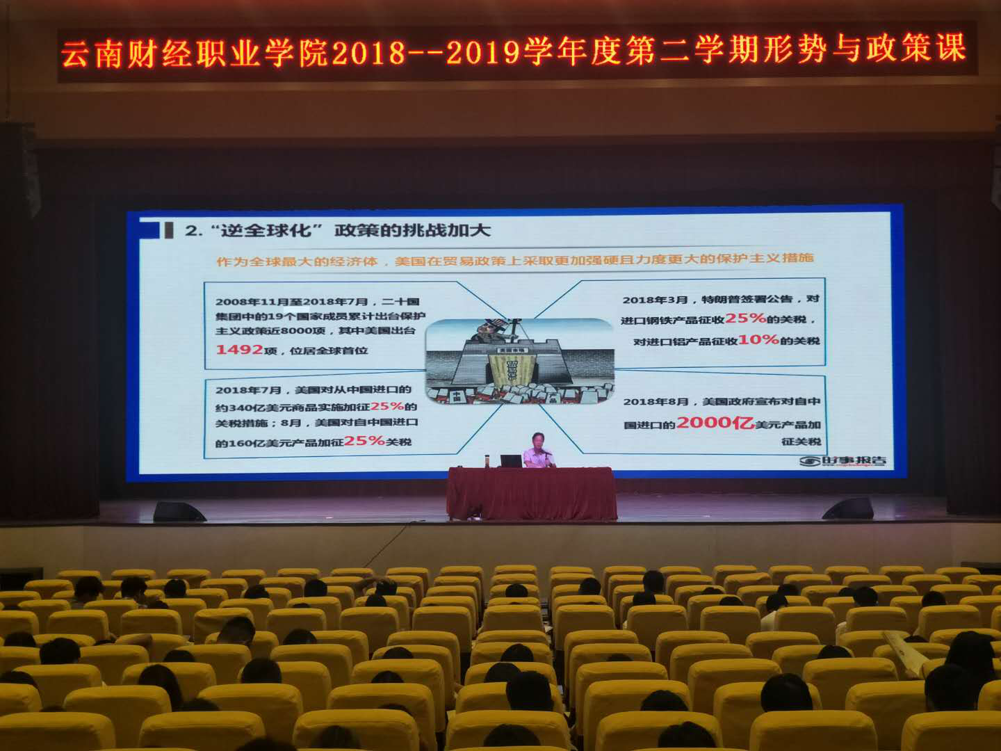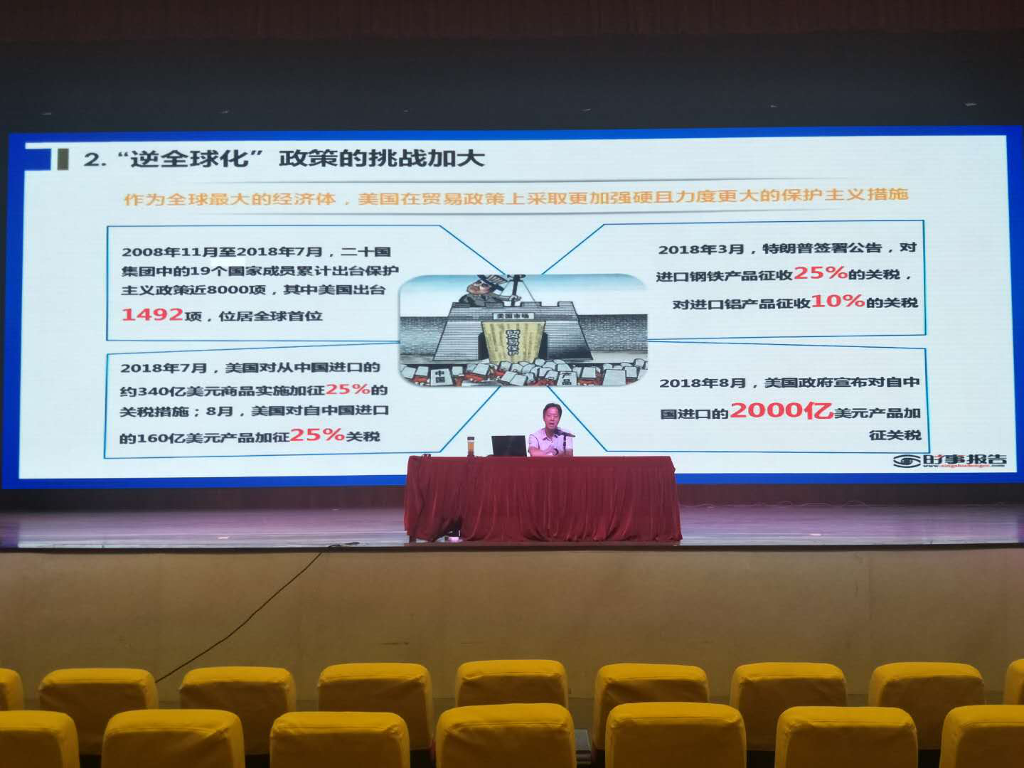 2019年6月4日晚,学院副院长仲新在大礼堂为2017级、2018级大学生作题为“经济全球化的退与进”的形势与政策专题讲座。