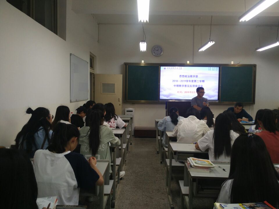 2019年5月7日中午12:40,思想政治教学部组织2018级和2017级财税金融系、工商管理系和信息工程系全体学习委员,在1号教学楼111教室召开本学期中期教学意见反馈暨征集意见座谈会。思政部主任及教研室主任参加了会议。