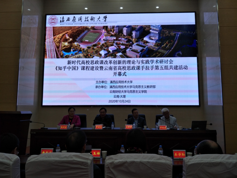 2020年10月23日至25日,新时代高校思政课改革创新理论与实践学术研讨会、《知乎中国》课程建设暨云南省高校思政课手拉手第五组共建活动在滇西应用技术大学举行。“手拉手”共建活动第五组组长单位云南财经大学和共建单位滇西应用技术大学、云南警官学院、云南开放大学、云南经济管理学院、大理护理职业学院、云南财经职业学院、云南城市建设职业学院、云南医药健康职业学院等9所院校马克思主义学院(思政部)负责人和骨干教师共70余人参加了会议。同时,参会的还有来自中国人民大学、复旦大学、中国传媒大学、武汉大学、华中科技大学、上海社科院、华东理工大学、华南师范大学、上海师范大学、长江大学、广西民族大学、华北电力大学的相关领导。我校副书记仲新、思政部主任李如良、朵尔奎、黄稳书、张芸薇、杨冉老师6人参加了会议。