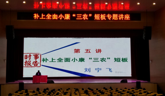 为深入贯彻习近平新时代中国特色社会主义思想,全面落实立德树人根本任务,按照学校《形势与政策》课安排,2020年12月3日下午在大礼堂,学校副院长刘宁飞以“补上全面小康三农短板”为主题,为我校2018级、2019级、2020级全体大学生讲授《形势与政策》课。