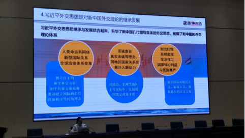 授课中严黄一仪同志围绕“中国外交取得的新成就”、“习近平外交思想”、“中国外交开创新局面”三个方面阐述了中国特色大国外交新局面。在新冠疫情按下暂停键时,习近平总书记通过“云外交”的方式出席各国会议,在与世界各国的交流中,同其他国家深入推进伙伴关系,拓展国家朋友圈,并积极参与全球治理体系改革和建设。