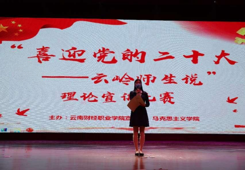 奋斗新时代、奋进新征程,为迎接党的二十大胜利召开,云南财经职业学院宣传部与马克思主义学院在学校党委的领导下,成功举办了“喜迎党的二十大——云岭师生说”理论宣讲比赛。4月26日下午,教师组比赛在学校大礼堂举行。学校党委副书记仲新亲临比赛现场,学校宣传部部、马克思主义学院、工商管理学院、财税与金融学院主要负责人出席了本次活动并担任评委。
