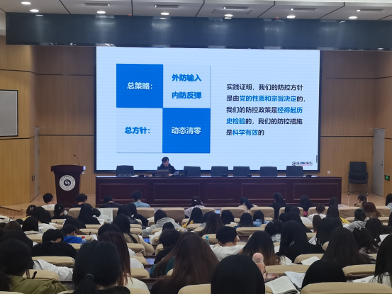 2022年9月29日下午14:20——15:40,学校党委副书记、校长邹丽在学校图书馆学术报告厅为我校2020级近300名学生上了一堂题为“高效统筹疫情防控和经济社会发展”的形势与政策专题讲座。