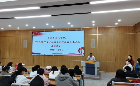 思想政治理论课是落实立德树人根本任务的关键课程。根据教务处要求和教学工作安排,2022年11月15日中午,马克思学院组织召开了2022-2023第一学期中期教学意见反馈会,全面了解马克思主义学院本学期教学运行情况,及时发现和解决教学中存在的问题,进一步规范后期教学管理,切实提高教学质量和教学效果。反馈会在学校体育馆阶梯教室举行,马克思主义学院领导、各教研室主任、教学秘书以及学校2020级、2021级(含5年制转段)、2022级(含5年制转段)所有专业共计100余名学生代表参加反馈会,会议由马克思主义学院院长主持。