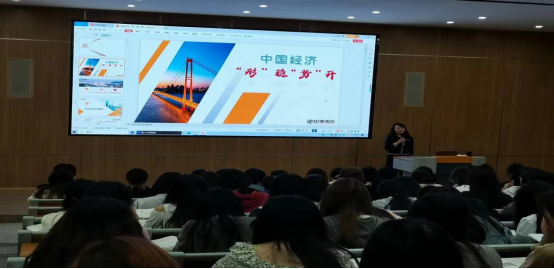 2023年10月19日晚上,学校校长邹丽在学校体育馆阶梯教室为我校2022级婴幼儿托育服务与管理两个班的学生上了一堂题为“中国经济形稳势升”的《形势与政策》专题讲座。