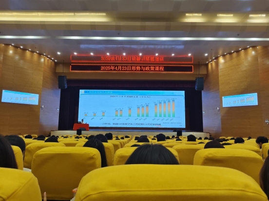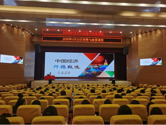 2025年4月23日晚,李雄副校长为我校10个教学班级近500余名学生讲授题为《中国经济行稳致远》的形势与政策课。