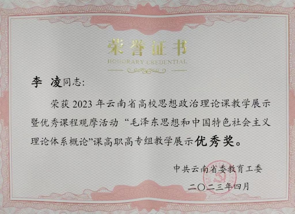 在今年3月举行的2023年云南省高校思想政治理论课教学展示暨优秀课程观摩活动中我校马克思主义学院思政课教师李凌、杨冉分别荣获毛泽东思想和中国特色社会主义理论体系概论课程(高职高专组)优秀奖和习近平新时代中国特色社会主义思想概论课程(高职高专组)三等奖,为学校争得了荣誉,展现了我校教师优良的精...